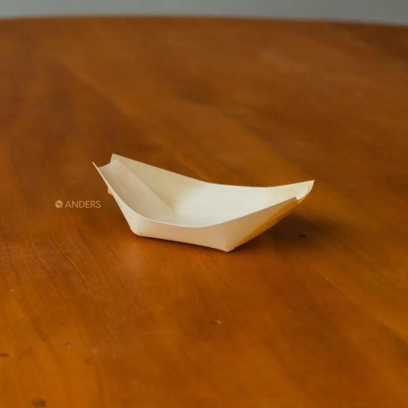 A barquinha de madeira para catering é recipiente descartável, geralmente fabricado a partir de lâminas de madeira, com um formato de barco.